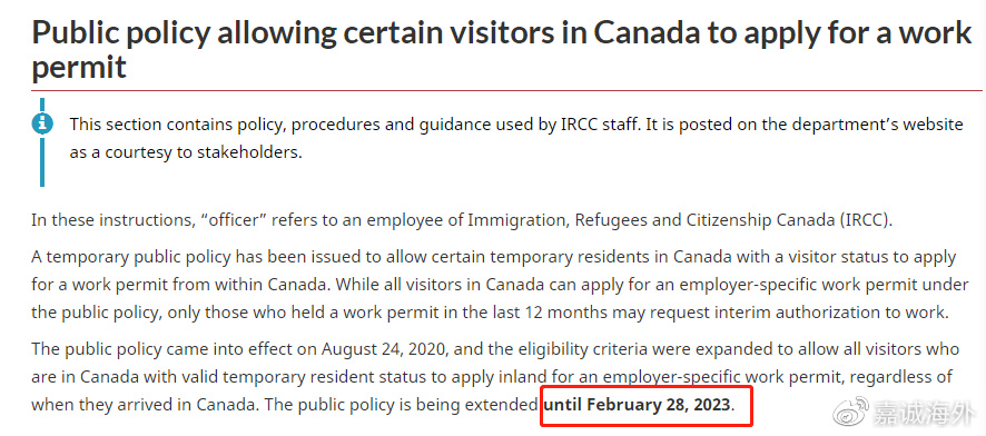 因此移民局于2020年8月24日出台了允许游客在加拿大境内申请LMIA工作签证的临时政策,当时公布的政策将于2021年3月31日截止。随后,移民局将该政策延期到2023年2月28日。