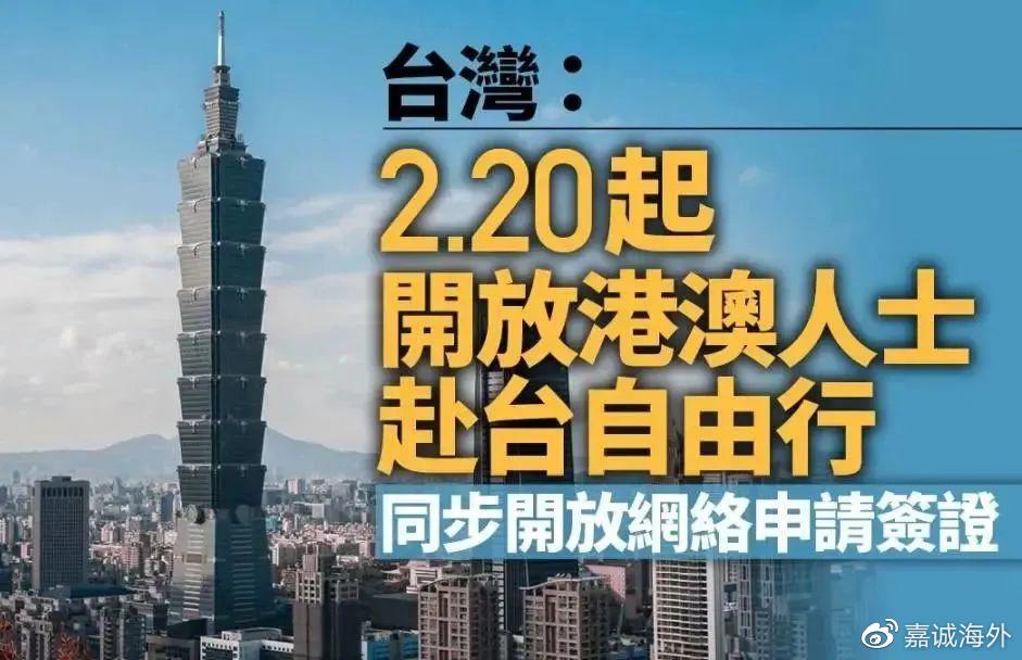 中国台湾地区当局2月14日宣布,港澳居民赴台自由行将于2月20日上午9时开放,同步恢复港澳居民网签及云端停留申请,疫情期间针对港澳居民实施的入境管制措施也将全部取消,届时港澳居民可通过网上申请临时停留许可赴台。