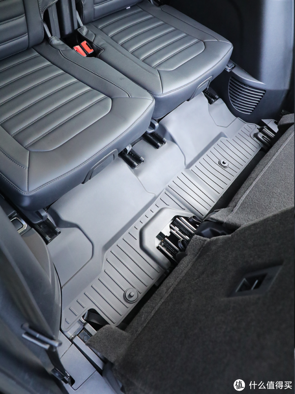 ▲第三排的展示,由于考虑到二排前后移动以及三排的放到升起,第三排脚垫前围没有设计高包,但是看了下市面上所售的脚垫都是这种设计,同时为了三排的空间也没有再增加毯面,但是不难发现,七座锐界三排的座椅还是不算小的,对于1.5米以下的儿童来说,绰绰有余!