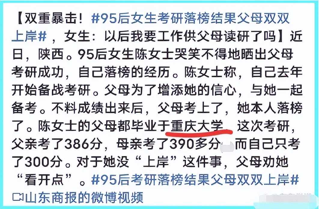 就像另外一个事情,有陕西的一个女孩在社交平台发文称,自己准备考研,但是学习压力很大,父母为了给自己减轻压力,就随便与女儿一起备考,然后参加了2023年考研的笔试。