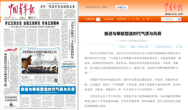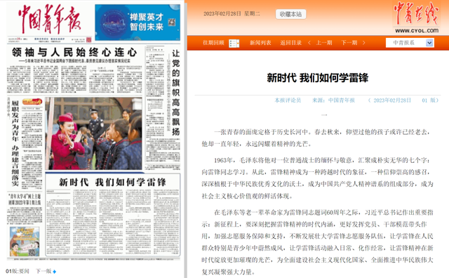 近几年,《中国青年报》持续刊登和雷锋有关的评论或报道:《我们为什么要继续高擎雷锋精神的火炬》《读懂了雷锋的快乐,才读懂了雷锋》《雷锋无须仰望 就在你我身旁》《让雷锋从每个人心中走向行动》《奋进与奉献塑造时代气质与风骨》《有一种精神在岁月长河中闪亮》《站在历史交汇点的守望与接力》《新时代 我们如何学雷锋》......