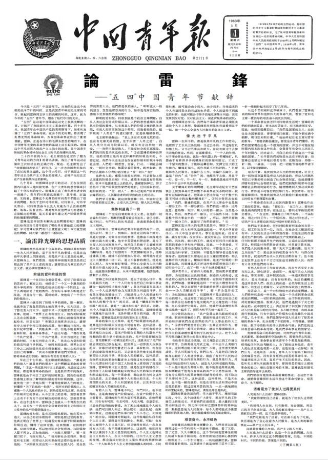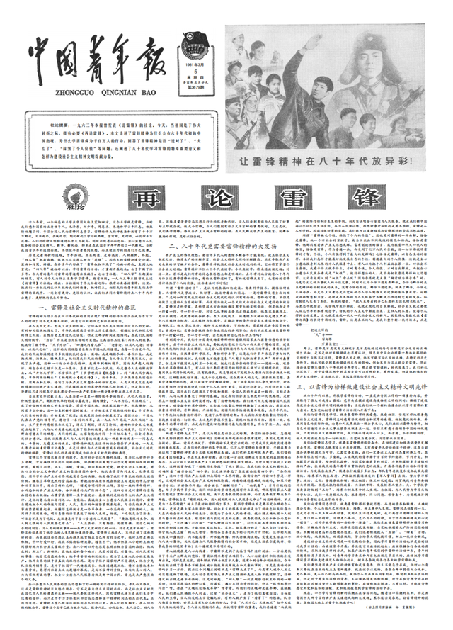 1963年5月4日、1981年3月5日、1983年3月5日,《中国青年报》分别刊登本报社论《论雷锋》《再论雷锋》《三论雷锋》,跨度20年的这 “三论”,在推进全民学雷锋活动中产生了巨大的影响。