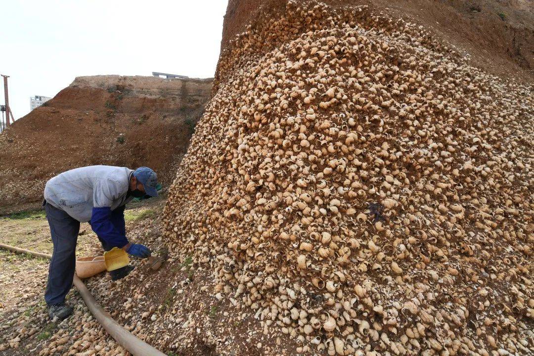 走进晋宁古城村遗址核心区,目光所及之处是堆积如山的螺蛳壳。“我们所看到的这些贝类绝大部分是来自滇池的螺蛳。古人食用过螺肉后丢弃的螺壳与灰土层层交替堆叠,就形成现在我们看到的居住面、活动面、路面、螺壳坑等贝丘遗址独特的遗迹现象。”考古工作人员谢桃云介绍,眼前的贝丘遗址是云南目前已知保存最完整的先滇时期环形贝丘遗址。