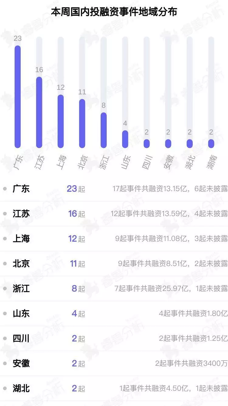 从本周披露获投企业的地域分布来看,主要集中在广东、江苏、上海。其中广东披露23个,江苏披露16个,上海披露12个。