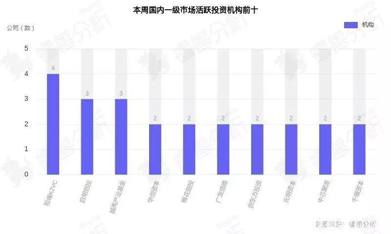 从机构投资活跃度来看,险峰K2VC(4个)、启明创投(3个)、越秀产业基金(3个)、华创资本(2个)、梅花创投(2个)等在本周创投市场中较为活跃。