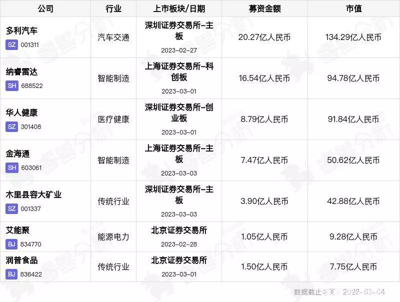 本周重点监测到国内上市公司共7家。分别位于主板、科创板、创业板、北交所。最新市值最高为「多利汽车」134.29亿元人民币。