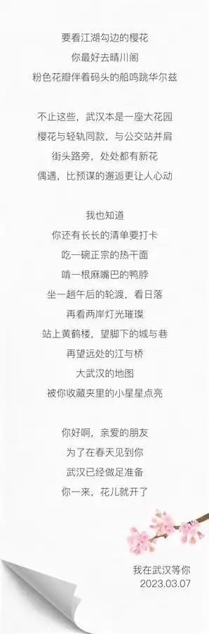 简介湖北日报讯 (通讯员武文旅)今日起,“相约春天赏樱花·2023打卡最武汉”樱花季系列活动正式启动,接下来的一个月,武汉准备...