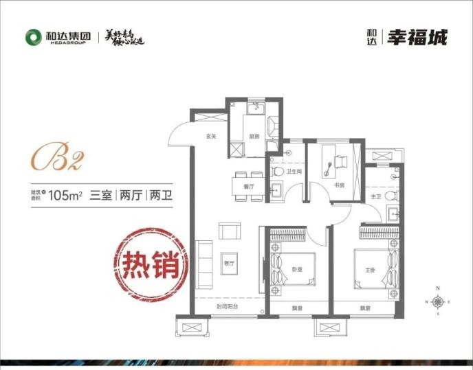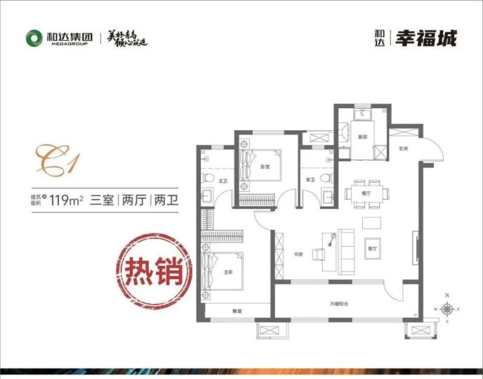 △效果图建面约119㎡户型。南向双联大阳台、三开间朝南,全明格局优势;创新二居/三居随心变空间格局,让阖家之乐惬意尽享。