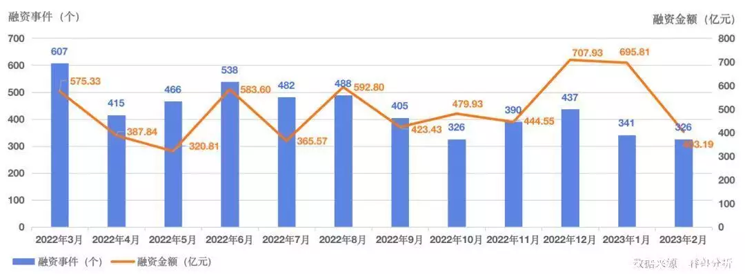 全球投融资月报睿兽分析整理最值得关注的国内外热门投融资事件,并提供投融资市场分析,帮助大家及时了解全球市场动向。2023年2月中国投融资市场概览睿兽分析数据显示,2023年2月,中国一级市场发生融资事件326个,比上月减少15个,下降4%;比去年同期减少282个,下降46%。已披露融资总额403.19亿元人民币,比上月减少292.61亿元人民币,减少42%;比去年同期减少137.92亿元人民币,减少25%。中国一级市场投融资事件月度走势(2022.03-2023.02)热门行业分布从融资事件发生的行业来看,排名前五的行业共发生融资事件180个,占所有行业事件总数的55%,前五行业分别是医疗健康、智能制造、企业服务、人工智能、汽车交通;前五行业涉及已披露总金额为170.83亿元人民币,占所有行业融资总量的42%。2023年2月中国一级市场投融资热门行业分布热门城市分布从融资事件发生的城市来看,本月排名第一的城市为深圳,共发生68个投融资事件;北京、上海均发生44个事件数量并列第二位;苏州紧随其后,发生41个投融资事件。2023年2月中国一级市场投融资热门城市分布新晋独角兽统计2023年2月,全球新增4家独角兽企业,其中中国新增1家。今年全球累计新增9家独角兽企业,其中中国累计新增4家,占比44%。全球当前总计有1868家独角兽企业,其中中国当前总计有561家,占比30%。2月新晋独角兽企业1. 碳化硅外延晶片研发商「天域半导体」天域半导体成立于2009年,是中国第一家从事碳化硅(SiC)外延晶片市场营销、研发和制造的民营企业。天域半导体在中国拥有最多的碳化硅外延炉-CVD,为全球客户提供n-型和p-型掺杂外延材料、制作肖特基二极管等。天域半导体近日完成12亿元人民币融资,投后估值接近130亿元人民币,投资方包括嘉元科技、招商资本、乾创投资、粤科金融、南昌工业控股、海富产业基金等。天域半导体本轮融资将继续用于增加碳化硅外延产线的扩产以及持续加大碳化硅大尺寸外延生长研发投入。2. 新能源存储技术公司「Our Next Energy」Our Next Energy是美国一家电动汽车电池研发商,成立于2020年,该公司专注于使用更安全、更可持续的材料开发先进的长程电池,同时致力于将更多的能量装入更小、更便宜的电池中。Our Next Energy近日完成2.38亿美元B轮融资,投后估值达12亿美元,本轮投资由Fifth Wall、Franklin Templeton领投,A轮投资者Temasek Holdings、Coatue、Riverstone Holdings继续加持,并引入2位新的战略投资者和2家市场化投资机构。本轮融资将用来建立公司第一家电池工厂ONE Circle,用于生产Aries II型磷酸铁锂电池组并不断扩大产能。3. 金融支付解决方案提供商「MNT-Halan」MNT-Halan是一家埃及金融科技公司,成立于2018年,主要围绕埃及及周边地区为没有银行账户的人或不活跃的银行客户提供无缝金融服务。MNT-Halan的产品包括商业贷款,消费金融,支付和电子商务等。MNT-Halan近日完成2.6亿美元融资后,跻身独角兽行列,投后估值超过10亿美元。本轮投资方包括以Chimera为代表的一些国际投资机构。4. 流媒体电视平台「Atmosphere」Atmosphere成立于2018年,是一家美国免费流式多频道平台,为企业提供50多个原创合作电视频道,并且为场地运营商提供增值服务。Atmosphere近日完成6500万美元D轮融资,投后估值达10亿美元。本轮由Sageview Capital领投,S3 Ventures、Valor Equity Partners等跟投,融资金额将用于加速企业增长并巩固市场地位。中国企业IPO市场分析睿兽分析数据显示,2023年2月,在全球交易所完成IPO上市的中国企业共计27家,数量比上月增加35%,比去年同期上升29%;募资金额总计230.69亿元人民币,金额比上月增加141%,比去年同期增加5%。其中登陆A股24家、美股3家。行业分布上,「智能制造」行业以6家IPO企业数量成为最热IPO赛道。地区分布上,浙江排名第一,当月新增5家IPO企业。本月新增的27家IPO企业中,有VC/PE支持的17家,VC/PE渗透率63%,涉及融资总额为89.53亿元人民币;有CVC支持的6家,CVC渗透率22%,涉及融资总额为43.83亿元人民币。从城市分布来看,新增IPO企业所在热门前五城市为上海、苏州、杭州、嘉兴、滁州。2023年2月IPO企业热门城市分布