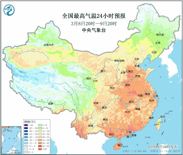 明后天,气温还将达到近期的高点。最高气温20℃线将抵达辽宁西部、内蒙古东南部、河北北部一带,华北南部到华南则会出现大范围25℃+,部分地区最高气温可能达到30℃。