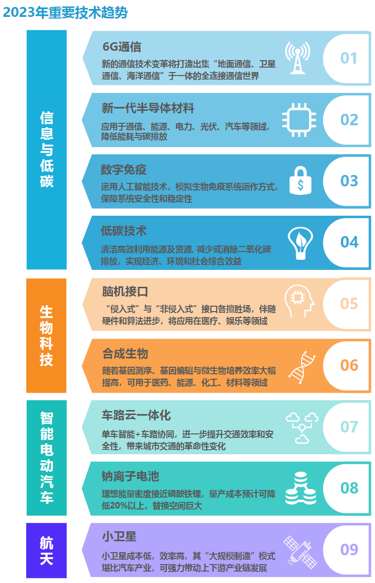 四大领域中,又可以细化为9个细分赛道:6G通信、新一代半导体材料、数字免疫、低碳技术、脑机接口、合成生物、车路云一体化、钠离子电池、小卫星。