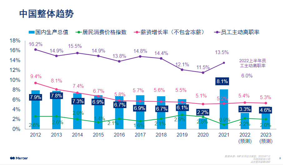 根据美世年度薪酬调研的结果,2022年中国企业薪资增长率为5.4%,预计2023年薪资增长率为5.3%。