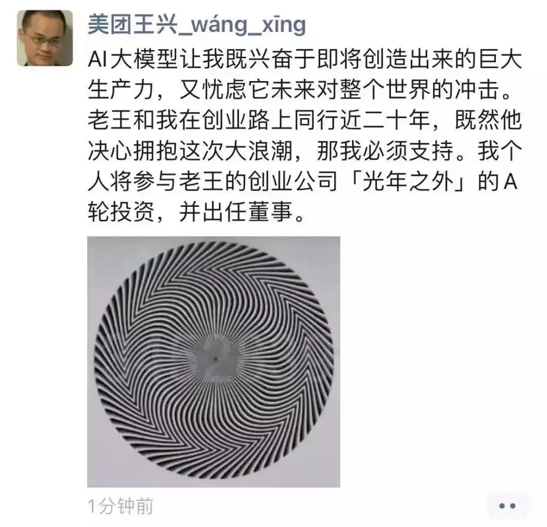 3 月 8 日,美团创始人王兴在朋友圈中透露,将以个人身份参与王慧文创业公司“光年之外”的 A 轮投资,并出任董事。王兴朋友圈原文称,“AI 大模型让我既兴奋于即将创造出来的巨大生产力,又忧虑它未来对整个世界的冲击。老王和我在创业路上同行近二十年,既然他决心拥抱这次大浪潮,那我必须支持。