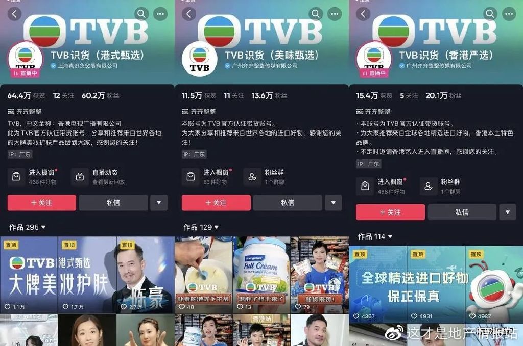 在此次鏖战淘宝直播之前,TVB其实已经在抖音试过水了。2022年4月,TVB宣布入驻抖音直播,除官方账号外,他们还有TVB识货(港式甄选)、TVB识货(香港严选)和TVB识货(美味甄选)这三个账号,一起直播带货。