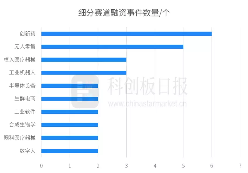 在细分赛道上,本周受投资人追捧的包括创新药、无人零售、植入医疗器械、工业机器人、半导体设备、生鲜电商、工业软件、合成生物学、眼科医疗器械、数字人。值得注意的是,6家获投创新药公司的研发管线包括肿瘤免疫药物、mRNA药物、重组蛋白药物等;3家获投植入医疗器械公司的注册产品包括人工心脏、高分子瓣膜等。