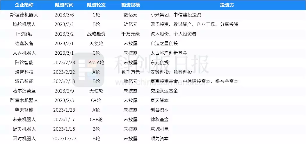 据创投通数据,近一年来,国内工业机器人领域有59家企业获得融资,部分案例如下表所示。