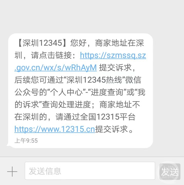 ▲深圳市12315消费平台发送的自助维权短信。10点21分,记者拨打上海市“12315市场监管服务热线”,等候10多秒就有人及时接听,客服向记者介绍消费问题维权的情况后,她告诉记者:“人工坐席工作时间是周一到周日的早上9点到下午6点,其余时间为语音智能服务。”