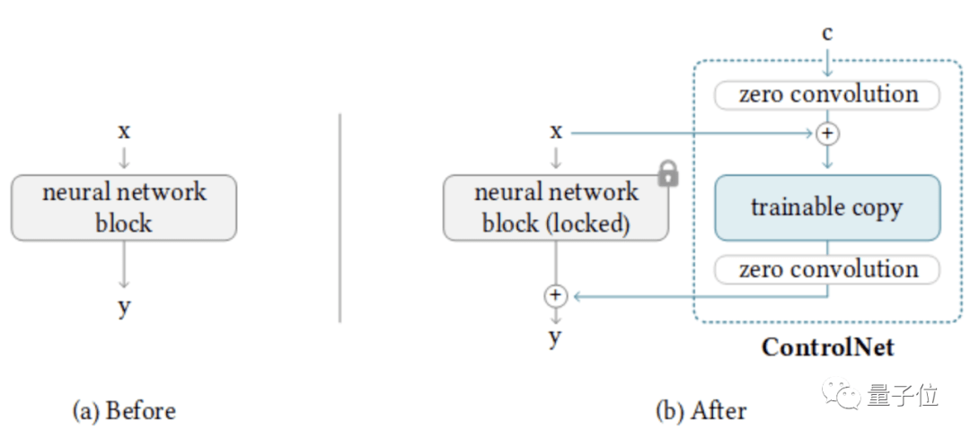 这个模型,可以将神经网络块的不同权重,分别复制到“锁定”副本 (locked copy)和“可训练”副本 (trainable copy)中。