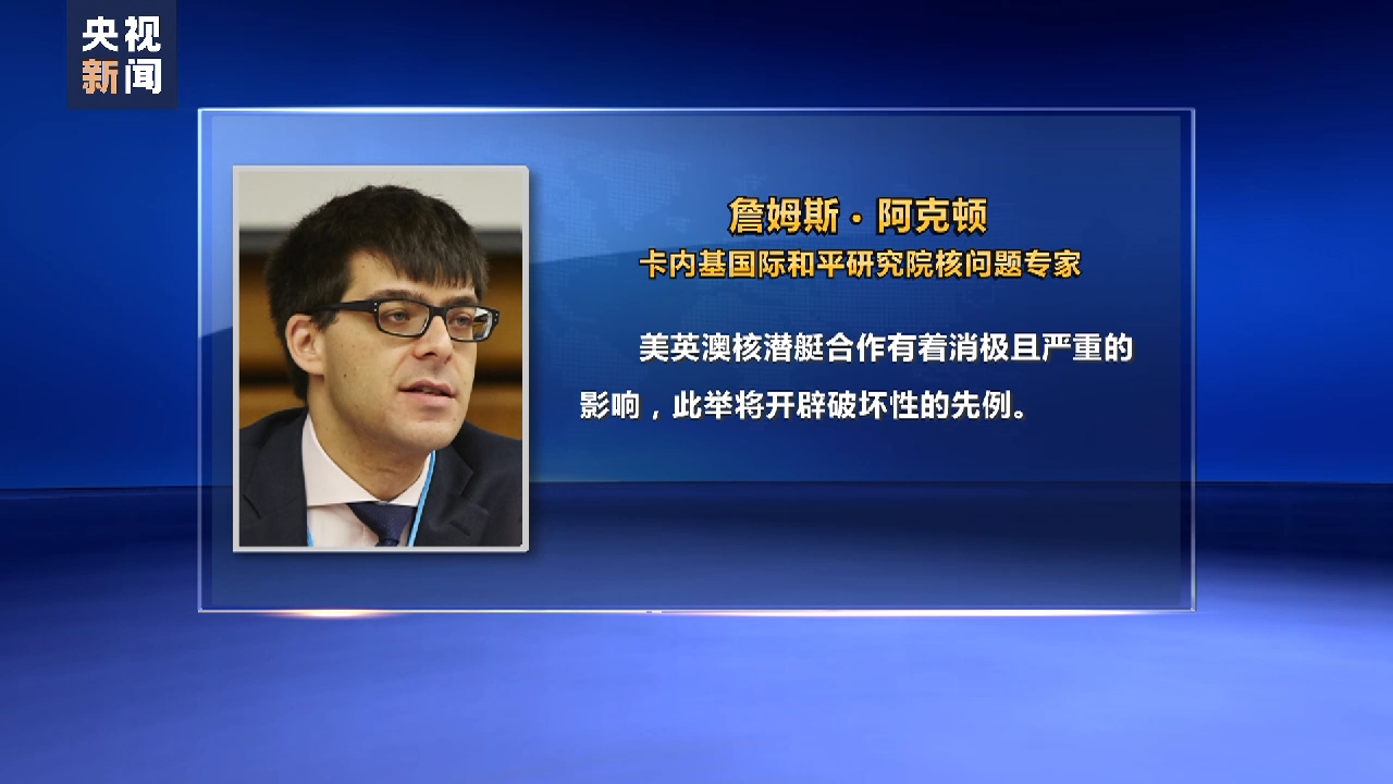 卡内基国际和平研究院核问题专家詹姆斯·阿克顿刊文表示,美英澳核潜艇合作有着消极且严重的影响,此举将开辟破坏性的先例。