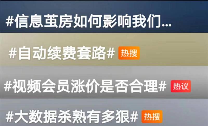 在信息传播中人们会选择想要的或能使自己愉悦的信息,久而久之接触的信息就越来越局限,这就是“信息茧房”效应。除了信息茧房,近年来引发消费者讨论的还有几种新问题:大数据杀熟,面对相同的商品和服务,老顾客看到的价格却比新顾客高;智能电视等智能设备,打开越发繁琐,对老人不友好;APP频繁索取权限、“自动续费的套路”……这些新问题引起网友频频吐槽,而它们的产生大多和算法推荐有着密不可分的关系。