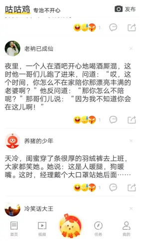 页面的右上角还有“发布”按钮,用户可以自主发布内容变成段子手。爱上头条打造这样的段子社区,旨在为用户好友之间参与互动提供了便利;同时也营造良好的观看趣事趣闻的环境,更是资讯阅读后放松的好办法。