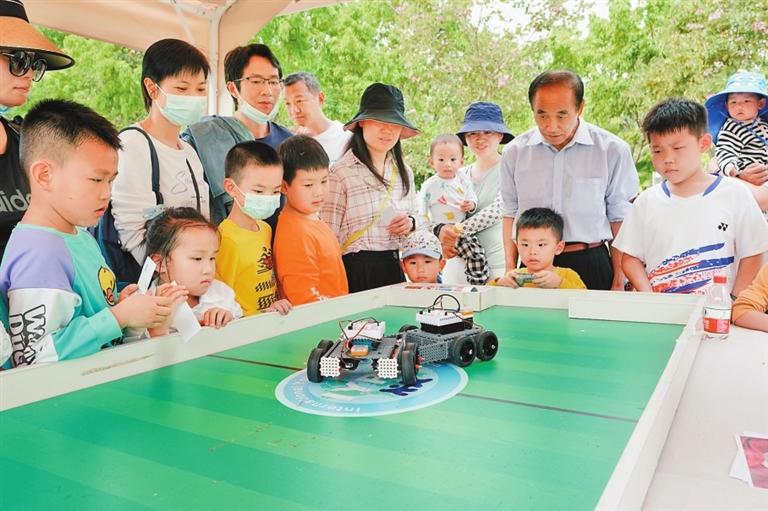 ▲活动现场,大人小孩围观机器车“踢”球。 深圳晚报记者 严文婷 摄