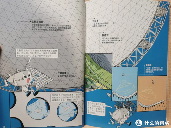用于接收信号的设备,叫做“馈源舱”,但这个专业的名字,十有八九会让小朋友搞不清状况,但是在这里“馈源舱”被比喻成人眼的”眼球“,小朋友一下子就明白了它的功能和重要性。