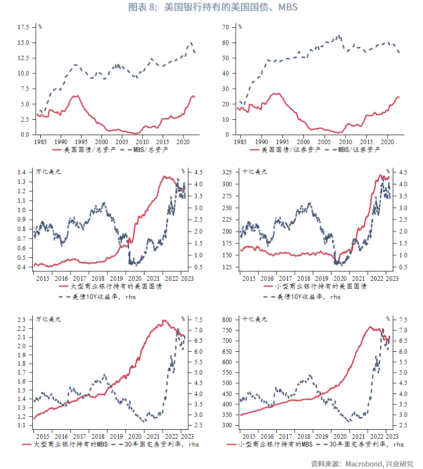 美联储加息对于美国国债和MBS的估值影响最为直接,这两类资产在美国银行资产中占有重要地位,约占银行总资产的20%,证券资产的70%。美国银行当前的债券浮亏主要来自于2022年美联储加息前的大量增持,当时美债10Y收益率尚不足2%,30年固定房贷利率在3%左右。2022年小型银行“越跌越买”,大型银行则一定程度缩减了利率敞口,因而小型银行可能面临更大的浮亏压力。