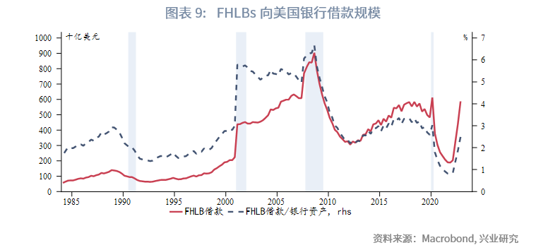 在缺少合格抵押品申请美联储BTFP的情况下,银行也可以用贷款资产从FHLBs换取流动性,尤其是使用在银行资产中占比较高的住房抵押贷款。FHLBs即联邦住房贷款银行,是美国金融体系重要的“影子银行”、资金融出方。FHLBs接受的抵押品包括1至4户住房抵押贷款、多户住房抵押贷款或其他相关资产MBS、美国政府担保或发行的债券和贷款、其他房地产相关抵押物(需要易于确定估值)等。FHLBs借款(FHLBs Advances)最高比例为银行总资产的20%~60%,视银行信用情况而定。2022年以来,FHLBs借款规模持续增长,反映出美国银行业流动性需求增加,不过当前FHLBs借款相对银行资产的占比还没有达到上一轮紧缩后期水平,也远低于次贷危机前水平。