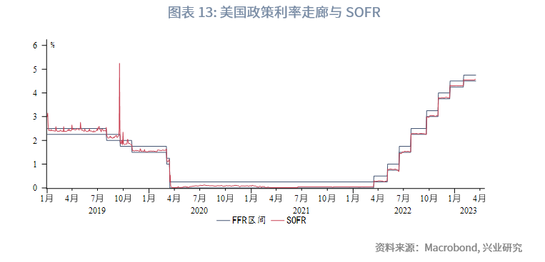 从联邦基金利率市场看,实际联邦基金利率(EFFR)的日内99分位数在2022年9月后开始持续高于联邦基金利率(FFR)目标上限,但1至75分位数仍在利率走廊中枢以下。同时SOFR利率依然维持在利率走廊下限附近,不同于2019年美元钱荒时的利率飙升。这反映出拆借市场流动性整体宽松,但是部分机构可能因为信用原因或缺少合格抵押品需要支付较高的溢价。