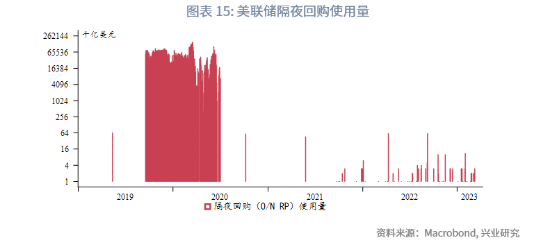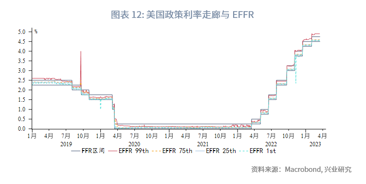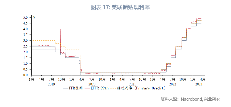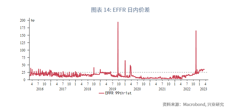 美联储流动性使用工具方面,目前隔夜回购使用量仍在较低水平,但是贴现窗口被大量使用,日间透支额也有所上升。回购同样需要提供合格抵押品,但贴现并不需要抵押品。目前贴现利率持平联邦基金利率上限,借款期限最长可达90天。在2022 年9月后EFFR 99分位数持续高于联邦基金利率上限。对于缺少合格抵押品的机构而言,既然无法使用回购,贴现窗口的成本比联邦基金利率更具吸引力。尽管通常认为贴现窗口具有“污点效应”,机构不会轻易使用,但对于中小机构而言,“污点效应”的负面影响相对较小,获得低成本流动性更为重要。