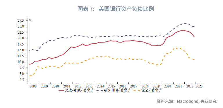 本轮美联储启动紧缩后,美国银行资产负债错配情况凸显,一方面是可售类(AFS)和持有到期类(HTM)资产占比达到次贷危机后新高,利率抬升带来未实现损失压力;另一方面低成本存款流失,现金储备下降,被挤兑风险提高。硅谷银行是美国银行业的缩影,其资产负债极端错配,成为了最薄弱的一环。