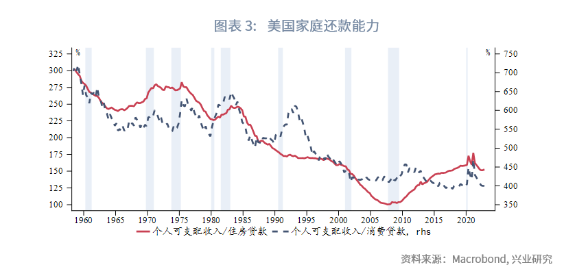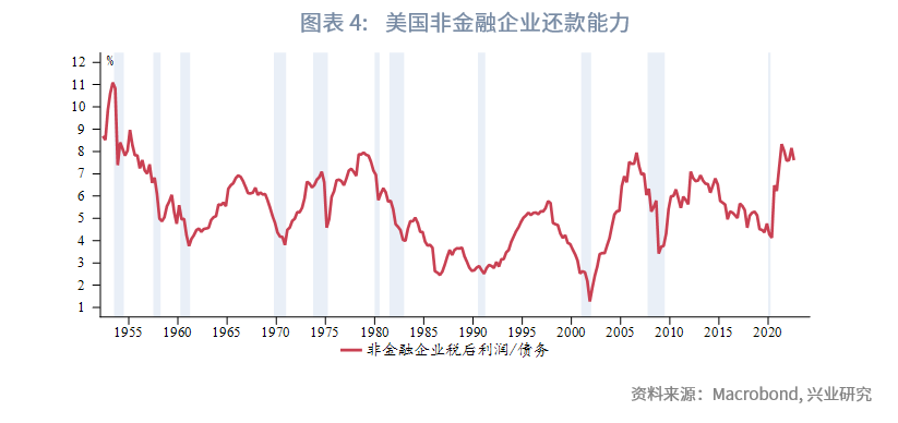 还款能力方面,以个人可支配收入与家庭住房贷款余额、消费贷款余额的比值衡量家庭还款能力。当前家庭房贷还款能力稍逊于疫情前,但仍显著好于次贷危机前水平;消费贷款还款能力基本持平疫情前。对非金融企业以企业税后利润与债务余额之比衡量企业还款能力,当前企业还款能力处于历史较高水平。