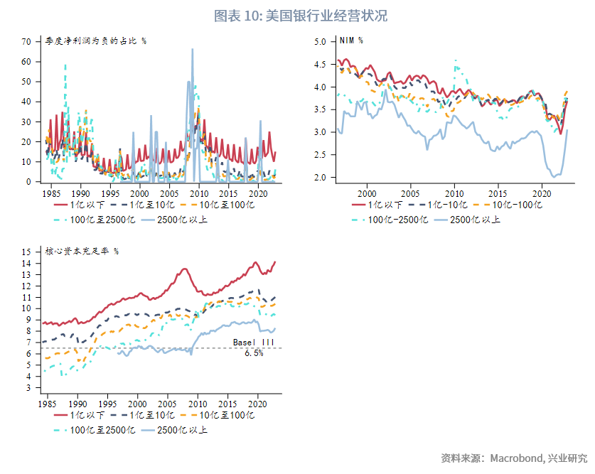 从银行经营状况看,美联储开启加息后银行净息差显著扩大,中大型银行经营状况良好,不过小型银行出现亏损的比例有所上升。虽然银行普遍存在未实现损失的情况,但核心资本充足率依然高于Basel III的要求。受到近期银行业危机冲击,美债利率显著下行有助于缓解未实现损失的情况。