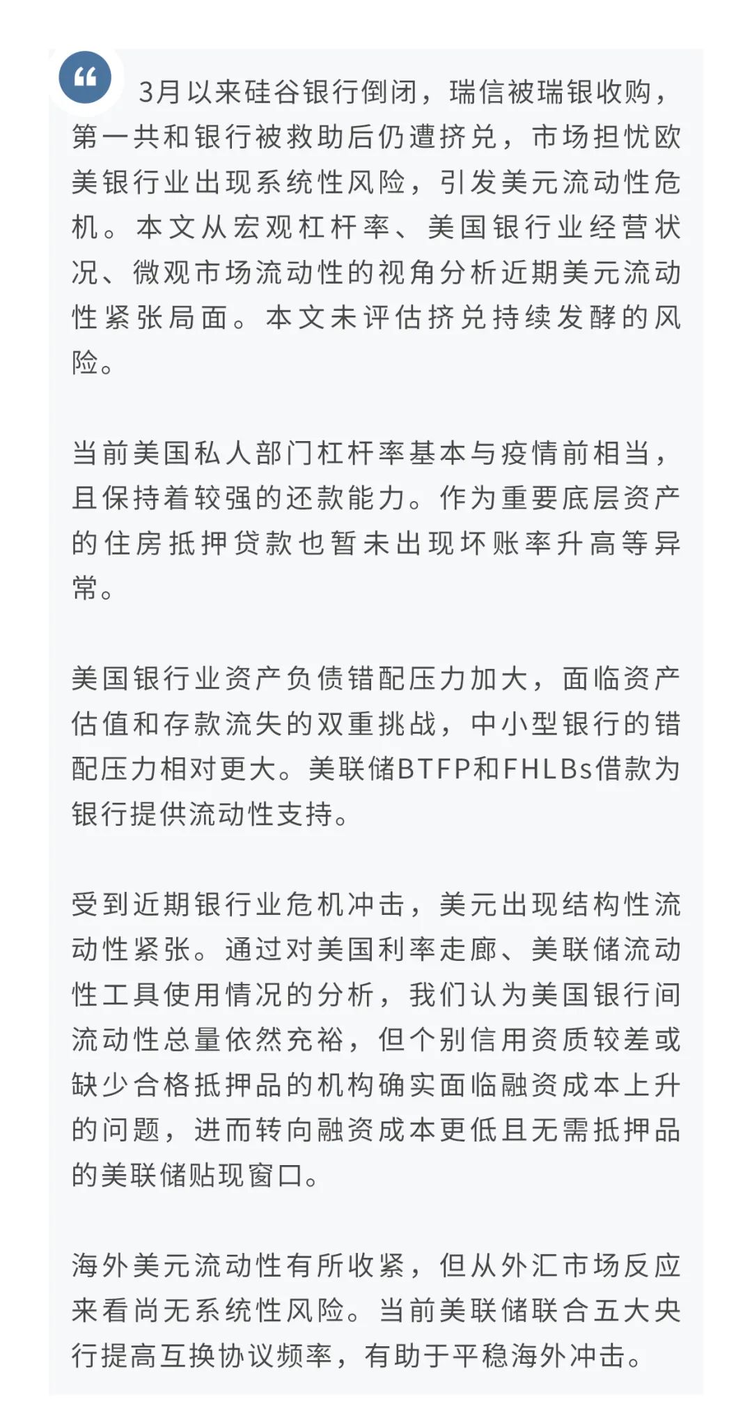 综合上文分析,当前美元流动性呈现出宏观总量充裕,微观流动性分化的特点。美国私人部门杠杆率并无显著增长,且保持着较强的还款能力。银行业资产负债错配压力有所加大,但整体经营状况良好。美国银行间市场仍有充足的流动性,然而部分机构可能因为信用资质、缺少合格抵押品等原因出现了流动性紧张。就目前而言,美联储面临的更多是局部流动性问题,而非宏观层面的债务危机或系统性风险。