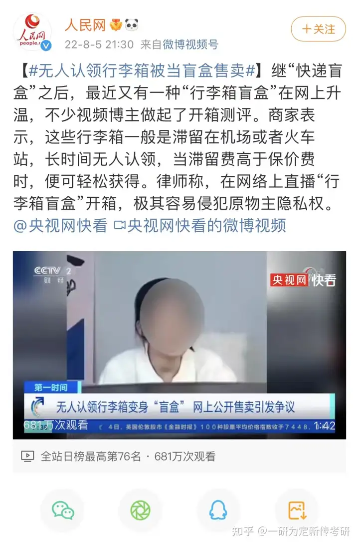 热点概述继“快递盲盒”之后,最近又有一种“行李箱盲盒”在网上升温,不少视频博主做起了开箱测评。商家表示,这些行李箱一般是滞留在机场或者火车站,长时间无人认领,当滞留费高于保价费时,便可轻松获得。律师称,在网络上直播“行李箱盲盒”开箱,极其容易侵犯原物主隐私权。关键词 盲盒经济、短视频、隐私侵犯热点解析 盲盒也叫“惊喜玩具”,指的是装有一系列的公仔形象的盒子,玩家凭借运气抽取,只有打开才知道自己抽取的玩偶类型。盲盒的与众不同就在于消费者不能通过包装获悉产品细节,这些商品的随机属性能够最大程度地能激发起消费者的好奇心、占有欲和赌徒心理,并给予逐渐“原子化”的年轻人以情感慰藉。在新媒体生产环境下,短视频行业中作品的流量和创作者的粉丝会为其带来显著的经济效益。因此,在短视频传播中由于大多数创作者具有严重的“流量思维”,因此在创作时过于追求短视频的吸引力,缺少应有的原则和底线,在网络上引发激烈的讨论和争议。舆论对“无人认领”行李箱的来源,存在明显的争议态度。有声音表示,行李箱有可能是从机场、火车站流传出来的,国外一些机场就有类似的公开拍卖行为。但主流观点认为,行李箱盲盒属于商家炒作行为,在网络上直播“行李箱盲盒”开箱,极其容易侵犯原物主隐私权,“其是否确系被遗弃的旅客行李,还得打上一个大大的问号”。诚然,不论“无人认领”行李箱是否来自于监管的灰色地带,此类低俗、侵权式营销的博眼球之风应及时刹住,相关部门应尽快处理,不给商家制造噱头的空间。关联案例快递盲盒热点三
