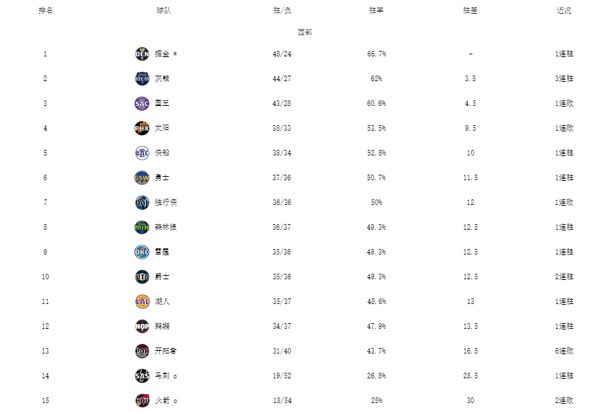 西部最近格局!勇士重返前六,爵士彻底反弹,湖人跌出附加赛区