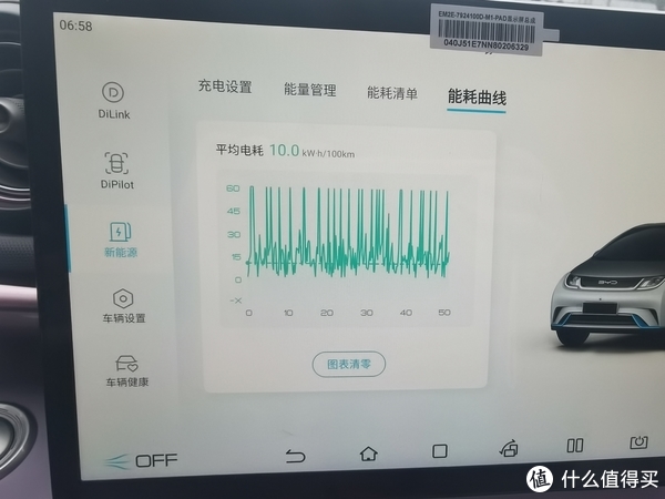 这个能耗曲线是从车子设置里面找到的,平均电耗显示10度每百公里,甚至图中曲线有些部分在0以下,这是在下坡路段,能量回收,所以出现负值。