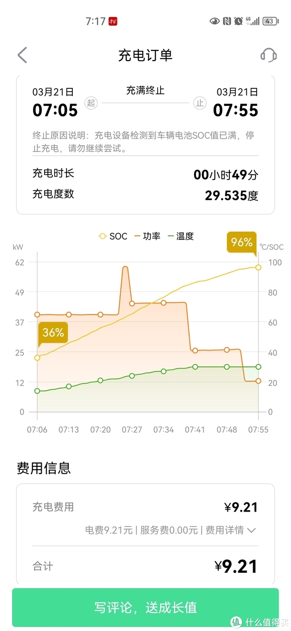 这是最近一次充电,从电量36%充到96%,用了50分钟,9.21元,够我一周通勤了,我每天上下班大概45—50公里,平均算下来比坐公交车都便宜。