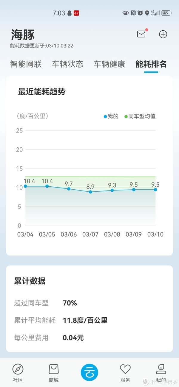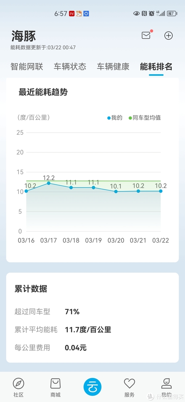 上面的图也可以看出来,我累计平均电耗也就11.7度百公里。