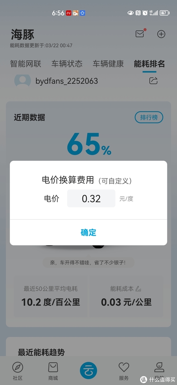 算一下使用成本,最近我常去的充电站做活动,免服务费(0.12元每度电),波谷用电只要0.32元,我一般早上七点钟去充电,到八点钟前结束。算下来每公里只要三分钱。