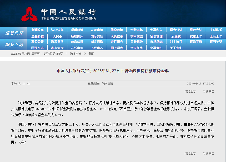 为推动经济实现质的有效提升和量的合理增长,打好宏观政策组合拳,提高服务实体经济水平,保持银行体系流动性合理充裕,中国人民银行决定于2023年3月27日降低金融机构存款准备金率0.25个百分点(不含已执行5%存款准备金率的金融机构)。本次下调后,金融机构加权平均存款准备金率约为7.6%。