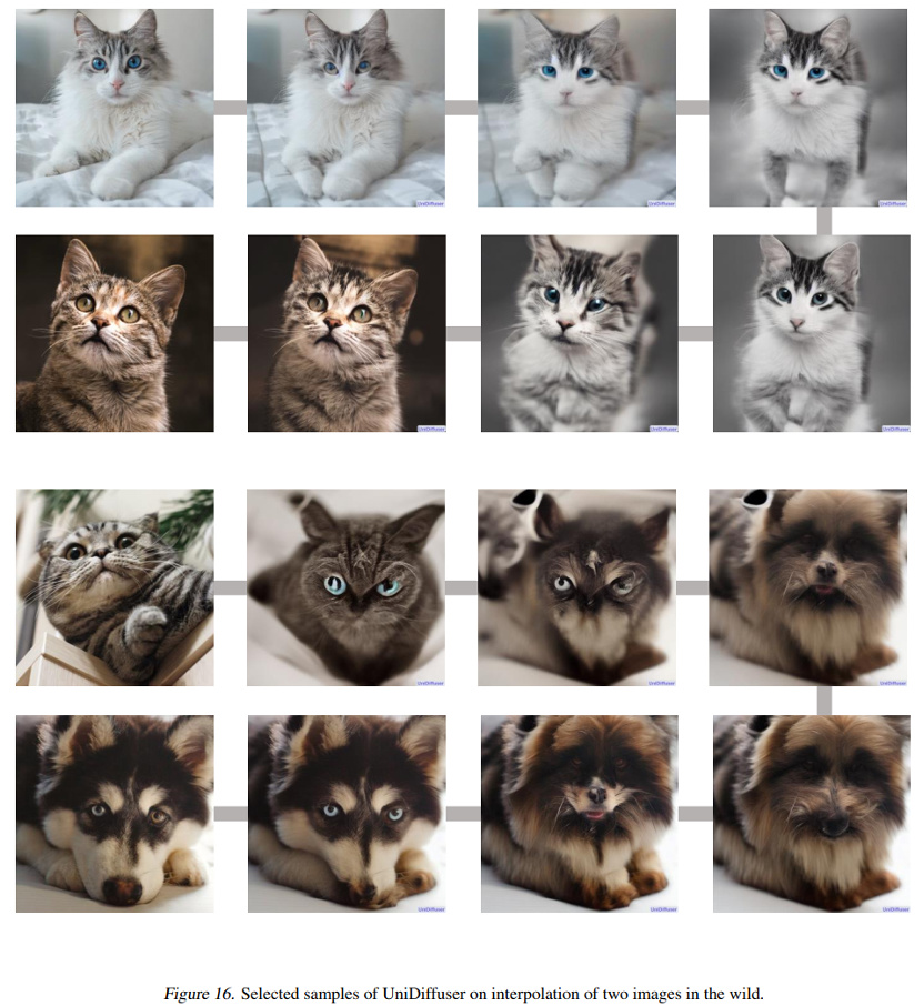 如下图 16 展示了 UniDiffuser 能对真实的两张图像进行插值: