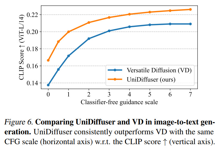 然后 UniDiffuser 和 Versatile Diffusion 进行了图到文上的效果比较。如下面的图 6 所示,UniDiffuser 在图到文上有更好的 CLIP Score。