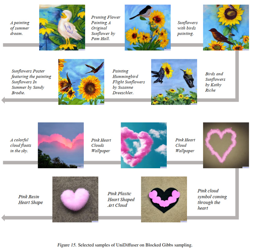 如下的图 15 展示了 UniDiffuser 能够实现在图文两个模态之间的来回跳跃 :