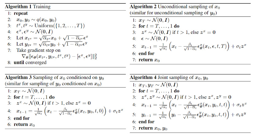 为噪声预测网络,同时预测两个模态上的噪声。在训练后,通过向噪声预测网络设置两个模态合适的时间,UniDiffuser 能够实现无条件、条件以及联合生成。例如将文本的时间设置为 0,可以实现文到图生成;将文本的时间设置为最大值,可以实现无条件图像生成;将图文时间设置为相同值,可以实现图文联合生成。下面罗列了 UniDiffuser 的训练和采样算法,可见这些算法相对原始的扩散模型均只做了微小的改动,易于实现。