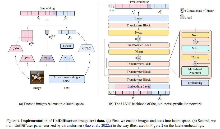 针对网络架构,研究团队提出使用基于 transformer 的架构来参数化噪声预测网络。具体地,研究团队采用了最近提出的 U-ViT 架构。U-ViT 将所有的输入都视作 token,并在 transformer 块之间加入了 U 型连接。研究团队也采用了 Stable Diffusion 的策略,将不同模态的数据都转换到了隐空间再进行扩散模型的建模。值得注意的是,U-ViT 架构同样来自该研究团队,并且已被开源在 https://github.com/baofff/U-ViT。