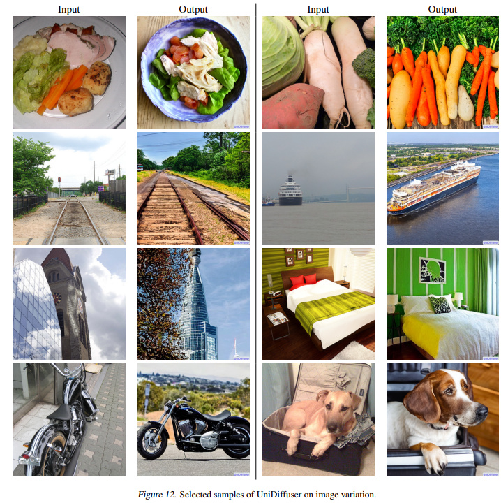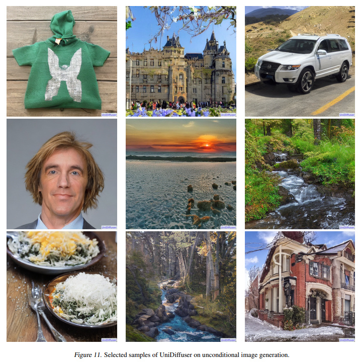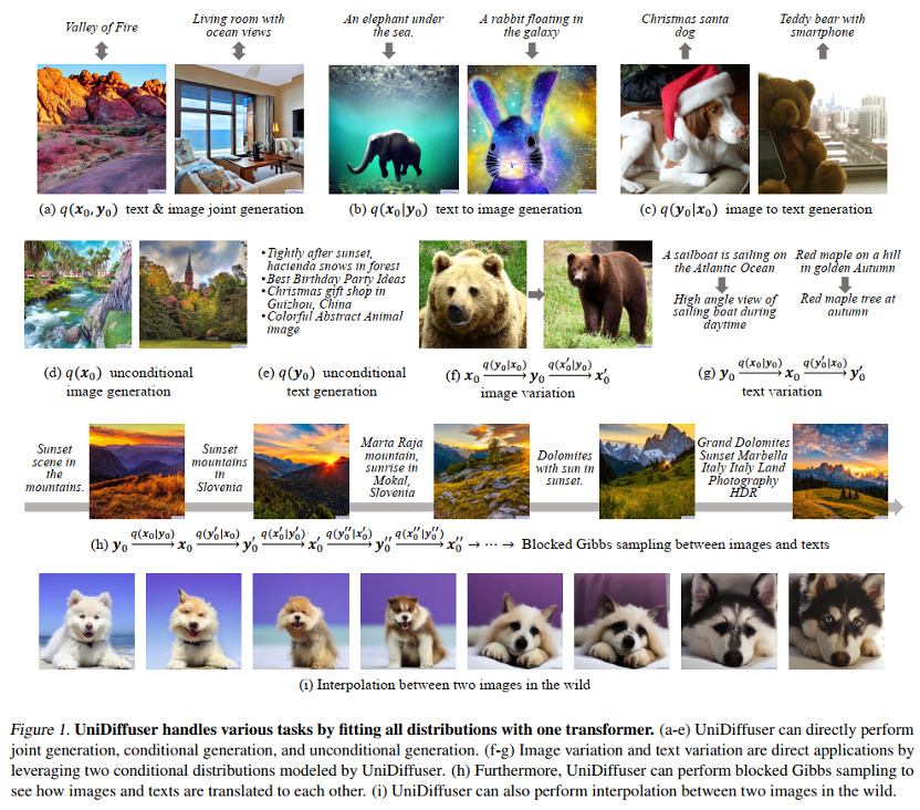 该论文提出了一个为多模态设计的概率建模框架 UniDiffuser,除了单向的文生图,还能实现图生文、图文联合生成、无条件图文生成、图文改写等多种功能。