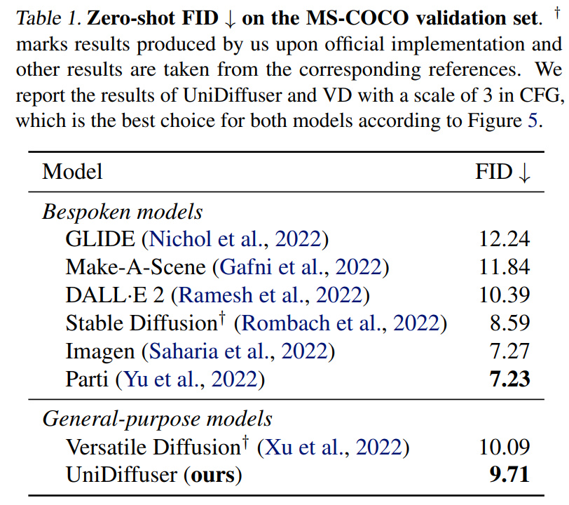 UniDiffuser 也和专用的文到图模型在 MS-COCO 上进行了 zero-shot FID 的比较。如下面的表 1 所示,UniDiffuser 可以和专用的文到图模型取得可比的效果。