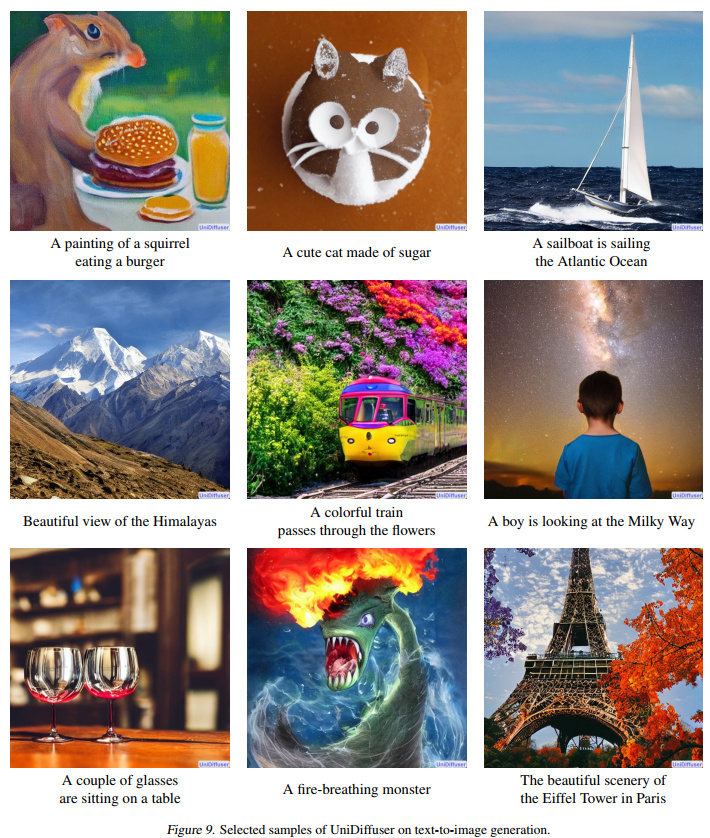 如下的图 9 展示了 UniDiffuser 在文到图上的效果: